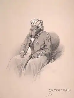 Earlier, in 1780, after the death of Ranjit Deo, the kingdom of Jammu (to the south of the Kashmir valley) was also captured by the Sikhs and made a tributary.[69] Ranjit Deo's grandnephew, Gulab Singh, subsequently sought service at the court of Ranjit Singh, distinguished himself in later campaigns and got appointed as the Raja of Jammu in 1820. With the help of his officer, Zorawar Singh, Gulab Singh soon captured for the Sikhs the lands of Ladakh and Baltistan.[69] The notable governors appointed to Kashmir by the Sikh kingdom include Moti Ram, Hari Singh, Kirpa Ram, Mihan Singh and Muhyuddin.