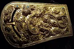 Silla artifacts, including unique gold metalwork, show influence from the northern nomadic steppes and Iranian peoples and especially Persians, with less Chinese influence than is shown by Goguryeo and Baekje.[125] Silla expanded rapidly by occupying the Nakdong River basin and uniting the city-states.