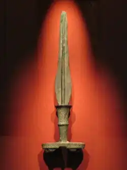 The Bronze Age in Korea is often held to have begun around 900–800 BC,[5] though the transition to the Bronze Age may have begun as far back as 2300 BC.[6] Bronze daggers, mirrors, jewelry, and weaponry have been found, as well as evidence of walled-town polities. Rice, red beans, soybeans and millet were cultivated, and rectangular pit-houses and increasingly larger dolmen burial sites are found throughout the peninsula.[36] Contemporaneous records suggest that Gojoseon transitioned from a feudal federation of walled cities into a centralised kingdom at least before the 4th century BC.[37] It is believed that by the 4th century BC, iron culture was developing in Korea by northern influence via today's Russia's Maritime Province.[38][39]