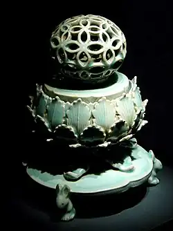 During this period, laws were codified and a civil service system was introduced. Buddhism flourished and spread throughout the peninsula. The development of celadon pottery flourished in the 12th and 13th centuries.[185][186] The production of the Tripitaka Koreana onto 81,258 wooden printing blocks,[187] and use of metal movable type attest to Goryeo's cultural achievements.[188][189][190][191][192]