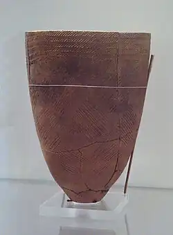 The earliest known Korean pottery dates back to around 8000 BC,[31] and evidence of Mesolithic Pit–Comb Ware culture (or Yunggimun pottery) is found throughout the peninsula, such as in Jeju Island. Jeulmun pottery, or "comb-pattern pottery", is found after 7000 BC, and is concentrated at sites in west-central regions of the Korean Peninsula, where a number of prehistoric settlements, such as Amsa-dong, existed. Jeulmun pottery bears basic design and form similarities to that of Mongolia, the Amur and Songhua river basins of Manchuria, the Jōmon culture in Japan, and the Baiyue in Southern China and Southeast Asia.[32][33]