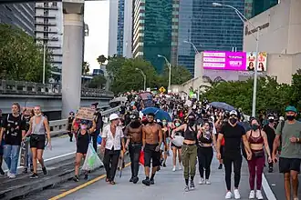 Miami was host to many dignitaries and notable people throughout the 1980s and '90s. Pope John Paul II visited in September 1987, and held an open-air mass for 150,000 people in Tamiami Park.[44] Queen Elizabeth II and three United States presidents also visited Miami. Among them is Ronald Reagan, who has a street named after him in Little Havana.[45] Nelson Mandela's 1989 visit to the city was marked by ethnic tensions. Mandela had praised Cuban leader Fidel Castro for his anti-apartheid support on ABC News' Nightline. Because of this, the city withdrew its official greeting and no high-ranking official welcomed him. This led to a boycott by the local African American community of all Miami tourist and convention facilities until Mandela received an official greeting. However, all efforts to resolve it failed for months, resulting in an estimated loss of over US$10 million.[46]