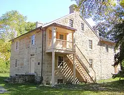 Fort Snelling was largely responsible for the establishment of the city of Minneapolis. The fort garrison built roads, planted crops, and built a grist mill and a sawmill at Saint Anthony Falls.[53] Later, Franklin Steele came to Fort Snelling as the post sutler. He established interests in lumbering and operated the ferries serving the fort from St. Paul and Mendota. When the Ojibwe signed a treaty ceding lands in 1837, Steele staked a claim to land on the east side of the Mississippi River adjacent to Saint Anthony Falls. In 1848, he built a sawmill at the falls, and the community of Saint Anthony developed along the east side of the falls. Steele told one of his employees, John H. Stevens, that land on the west side of the falls would make a good site for future mills. Since the land on the west side was still part of the military reservation, Stevens made a deal with Fort Snelling's commander. Stevens would provide free ferry service across the river in exchange for a tract of 160 acres (0.65 km2) at the head of the falls. Stevens received the claim and built a house, the first house in Minneapolis, in 1850. In 1854, Stevens platted the city of Minneapolis on the west bank.[56] Later, in 1872, Minneapolis absorbed the city of Saint Anthony.[57]