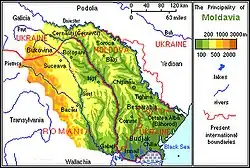 The medieval Principality of Moldavia was established in 1359 and covered the so-called Carpathian–Danube–Dniester area, stretching from Transylvania in the west to the Dniester River in the east.[6] Its territory comprised the present-day territory of the Republic of Moldova, the eastern 8 of the 41 counties of Romania (a region still called Moldova by the local population), the Chernivtsi oblast and Budjak region of Ukraine. Its nucleus was in the northwestern part, the Țara de Sus ("Upper Land"), part of which later became known as Bukovina. The name of the principality originates from the Moldova River.