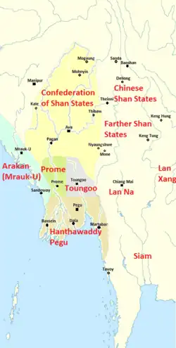 Beginning in the 1480s, Ava faced constant internal rebellions and external attacks from the Shan States, and began to disintegrate. In 1510, Taungoo, located in the remote southeastern corner of the Ava kingdom, also declared independence.[21] When the Confederation of Shan States conquered Ava in 1527, many refugees fled southeast to Taungoo, the only kingdom in peace, and one surrounded by larger hostile kingdoms.