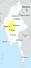 The Burmans who had come down with the early 9th Nanzhao raids of the Pyu states remained in Upper Burma. (Trickles of Burman migrations into the upper Irrawaddy valley might have begun as early as the 7th century.[12]) In the mid-to-late 9th century, Pagan was founded as a fortified settlement along a strategic location on the Irrawaddy near the confluence of the Irrawaddy and its main tributary the Chindwin River.[13]