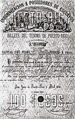 Spain did not abolish slavery in Puerto Rico until 1873, at the very beginning of the First Republic. In reality, slaves had to enter into a three-year contract with their masters, who would be compensated under the supervision of an assembly of notables and landowners. Freedmen only took possession of their rights after five years.