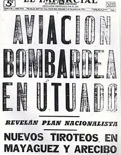 In retaliation for the "Río Piedras massacre" at the University of Rio Piedras, on February 23, 1936, Nationalists Hiram Rosado and Elias Beauchamp killed Colonel E. Francis Riggs in San Juan. They were taken into custody where they were killed by policemen and officers while being held at the San Juan headquarters.[75] Rosado and Beauchamp were declared heroes by the Nationalist Party president, Pedro Albizu-Campos.[76] Shortly after, the San Juan Federal Court had Albizu arrested for his incitement of discontent. After initially being found innocent in a jury with seven Puerto Ricans and two North Americans, the judge ordered a new jury which had ten North Americans and two Puerto Ricans, who found him guilty.[76] On July 31, 1936, Albizu and several other Nationalists such as Juan Antonio Corretjer and Clemente Soto Vélez were convicted of being associated with Riggs' murder. They were sentenced to six to 10 years in a federal prison in the United States.[77]
