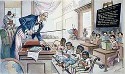 Though the act created a more structured government for the island, the United States Congress still held the right to veto or amend bills and laws passed by the territorial legislature.[63] In addition to veto power, the United States could prevent the enforcing of actions taken by the legislature.[64] The Act stated that the President of the United States was to appoint members of the Puerto Rico's legislative branch, as well as the directors of the six major government departments: Agriculture and Labor, Health, Interior, and Treasury (with the advice of Congress) and the Attorney General and the Commissioner of Education.[63] The Act also made English the official language of the Puerto Rican courts, government, and the public education systems.