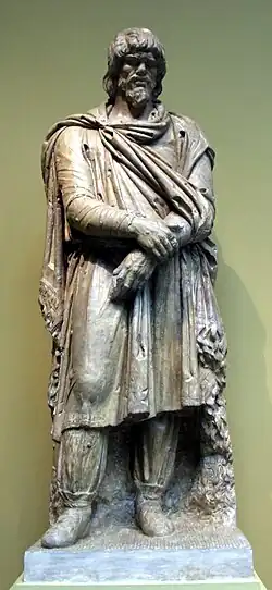 Due to the fluctuating nature of the Dacian states, especially before the time of Burebista and before the 1st century AD, the Dacians would often be split into different kingdoms. Known rulers of the Dacians include Charnabon in the 5th century BC, Cothelas in the 4th century BC,[8] Rex Histrianorum mentioned in 339 BC, Dual in the 3rd century BC, Moskon in the 3rd century BC,[9] Dromichaetes in the 3rd century BC,[10] Zalmodegicus around 200 BC,[11][12] Rhemaxos also around 200 BC,[13][14] Rubobostes before 168 BC,[15] Zoltes after 168 BC,[16] Oroles in the 2nd century BC,[17] Dicomes in the 1st century BC,[18] Rholes in the 1st century BC,[19] Dapyx in the 1st century BC,[20] Zyraxes in the 1st century BC,[21] Burebista between 82 and 44 BC,[22] Deceneus between 44 BC and around 27 BC,[23] Thiamarkos between 1st century BC and 1st century AD,[24] Cotiso between c. 40 BC and c.9 BC,[25] Comosicus between 9 BC and 30 AD,[26] Scorilo between c. 30 AD and 70 AD[26] Coson in the 1st century AD,[27] Duras between c. 69 AD to 87 AD,[27] and Decebalus between 87 AD to 106 AD.[28] Dacia became a province of the Roman Empire in 106 AD, conquered by Emperor Trajan. However the Free Dacians outside of the Roman Empire remain independent under Pieporus, king of Dacian Costoboci in the 2nd century AD,[29][30] and possibly Tarbus in the 2nd century AD.[31][32]