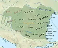 Geto-Dacians inhabited both sides of the Tisa river prior to the rise of the Celtic Boii and again after the latter were defeated by the Dacians under the king Burebista.[36] It seems likely that the Dacian state arose as a tribal confederacy, which was united only by charismatic leadership.[36] Before 168 BC,[37] under the rule of king Rubobostes in present-day Transylvania, the Dacians' power in the Carpathian basin increased after they defeated the Celts, who held power in the region since the Celtic invasion of Transylvania in the 4th century BC.