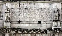 After Augustus's victory in the civil wars, the Romans punished the Dacian ruler, who was apparently defeated in battle around 25 BC.[45] In his account of his achievements as emperor, the Res Gestae, Augustus claimed that the Dacians had been subdued. This was not entirely true, because Dacian troops frequently crossed the Danube to ravage parts of Pannonia and Moesia.[46] He may have survived until the campaign of Marcus Vinicius in the Dacian area c.9 BC. Vinicius was the first Roman commander to cross the Danube and invade Dacia itself. Ioana A. Oltean argues that Cotiso probably died at some point during this campaign.[47] According to Jordanes Cotiso was succeeded by Comosicus, about whom nothing is known beyond the name.[47] King Scorilo was Comosicus' successor and may have been the father of Decebalus. The Roman historian Jordanes lists a series of Dacian kings before Decebalus, placing a ruler called "Coryllus" between Comosicus and the independently attested Duras, who preceded Decebalus as king. Coryllus is supposed to have presided over a long peaceful 40-year rule, however, the name Coryllus is not mentioned by any other historian, and it has been argued that it "is a misspelling of Scorilo, a relatively common Dacian name".[48] On this basis, Coryllus has been equated with the Scorilo named on an ancient Dacian pot bearing the words “Decebalus per Scorilo”. Though far from certain, this has also been translated as "Decebalus son of Scorilo". If so, this might mean that Decebalus was the son of Scorilo, with Duras possibly being either an older son or a brother of Scorilo.[49] A Dacian king (dux Dacorum) called Scorilo is also mentioned by Frontinus, who says he was in power during a period of turmoil in Rome.[50] From this evidence and references to Dacian kings elsewhere, it is suggested that Scorilo probably ruled from the 30s or 40s AD through to 69–70.[50]
