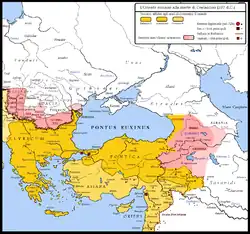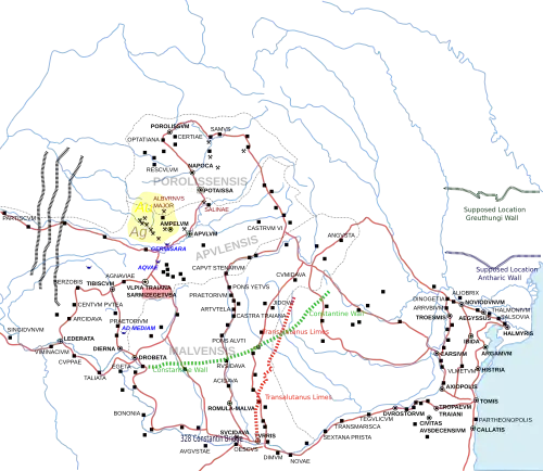 In 328 the emperor Constantine the Great inaugurated the Constantine's Bridge (Danube) at Sucidava, (today Corabia in Romania)[96] in hopes of reconquering Dacia, a province that had been abandoned under Aurelian. In the late winter of 332, Constantine campaigned with the Sarmatians against the Goths. The weather and lack of food cost the Goths dearly: reportedly, nearly one hundred thousand died before they submitted. In celebration of this victory Constantine took the title Gothicus Maximus and claimed the subjugated territory as the new province of Gothia.[97] In 334, after Sarmatian commoners had overthrown their leaders, Constantine led a campaign against the tribe. He won a victory in the war and extended his control over the region, as remains of camps and fortifications in the region indicate.[98] Constantine resettled some Sarmatian exiles as farmers in Illyrian and Roman districts, and conscripted the rest into the army. The new frontier in Dacia was along the Brazda lui Novac line supported by Castra of Hinova, Rusidava and Castra of Pietroasele.[99] The limes passed to the north of Castra of Tirighina-Bărboși and ended at Sasyk Lagoon near the Dniester River.[100] Constantine took the title Dacicus maximus in 336.[101] Some Roman territories north of the Danube resisted until Justinian.