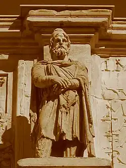 Dacian religion was considered by the classic sources as a key source of authority, suggesting to some that Dacia was a predominantly theocratic state led by priest-kings. However, the layout of the Dacian capital Sarmizegethusa indicates the possibility of co-rulership, with a separate high king and high priest.[36] Ancient sources recorded the names of several Dacian high priests (Deceneus, Comosicus and Vezina) and various orders of priests: "god-worshipers", "smoke-walkers" and "founders".[36] Both Hellenistic and Oriental influences are discernible in the religious background, alongside chthonic and solar motifs.[36] According to Herodotus' account of the story of Zalmoxis or Zamolxis,[114] the Getae (speaking the same language as the Dacians and the Thracians, according to Strabo) believed in the immortality of the soul, and regarded death as merely a change of country. Their chief priest held a prominent position as the representative of the supreme deity, Zalmoxis, who is called also Gebeleizis by some among them.[114][158] Strabo wrote about the high priest of King Burebista Deceneus: "a man who not only had wandered through Egypt, but also had thoroughly learned certain prognostics through which he would pretend to tell the divine will; and within a short time he was set up as god (as I said when relating the story of Zamolxis)".[159]
