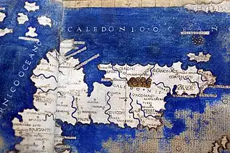 Of the surviving pre-Roman accounts of Scotland, the first written reference to Scotland was the Greek Pytheas of Massalia, who may have circumnavigated the British Isles of Albion (Britain) and Ierne (Ireland)[29][30] sometime around 325 BC. The most northerly point of Britain was called Orcas (Orkney).[31][32]: 10 By the time of Pliny the Elder, who died in AD 79, Roman knowledge of the geography of Scotland had extended to the Hebudes (The Hebrides), Dumna (probably the Outer Hebrides), the Caledonian Forest and the people of the Caledonii, from whom the Romans named the region north of their control Caledonia.[33] Ptolemy, possibly drawing on earlier sources of information as well as more contemporary accounts from the Agricolan invasion, identified 18 tribes in Scotland[34] in his Geography, but many of the names are obscure and the geography becomes less reliable in the north and west, suggesting early Roman knowledge of these areas was confined to observations from the sea.[35]