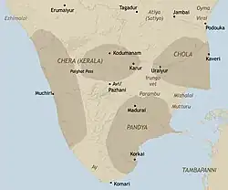 Ancient Tamil Nadu contained three monarchical states, headed by kings called Vendhar and several tribal chieftaincies, headed by the chiefs called by the general denomination Vel or Velir.[20][21] Still lower at the local level there were clan chiefs called kizhar or mannar.[22] During the 3rd century BCE, the Deccan was part of the Maurya Empire, and from the middle of the 1st century BCE to 2nd century CE the same area was ruled by the Satavahana dynasty. The Tamil area had an independent existence outside the control of these northern empires. The Tamil kings and chiefs were always in conflict with each other mostly over the property. The royal courts were mostly places of social gathering rather than places of dispensation of authority; they were centres for distribution of resources. Tamil literature Tolkappiyam sheds some light on early religion.[23] Gradually the rulers came under the influence of Vedic beliefs, which encouraged performance of sacrifices to enhance the status of the ruler.[24] Buddhism, Jainism and Ajivika co-existed with early Shaivite, Vaishnavism and Shaktism during the first five centuries.