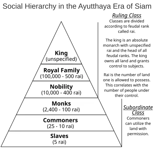 The Sakdina (Thai: ศักดินา) system of social hierarchy was established at the beginning of the Ayutthaya Kingdom. It assigned a numerical rank (rai) to each person depending on their status. This determined their position in society. There were 6 classes in society: the king, royal family, nobility, monks, commoners and slaves. The king was an absolute monarch and owned all the land. The king granted control of the land to his subjects. The nobility had important leading roles. The learned Buddhist monks were above commoners. The lowest class were various slaves. The numbers represented the number of rai of land a person was entitled to own. In practice it indicated the number of people under control. The sakdina system was used for around 600 years till the early era of the Rattanakosin Kingdom.