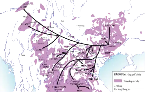 Map showing linguistic family tree overlaid on a geographic distribution map of Tai-Kadai family. This map only shows general pattern of the migration of Tai-speaking tribes, not specific routes, which would have snaked along the rivers and over the lower passes.
