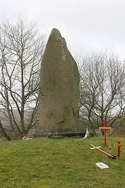 The earliest iron implement found in Wales is a sword from Llyn Fawr which overlooks the head of the Vale of Neath, which is thought to date to about 600 BC.[25] Hillforts continued to be built during the British Iron Age. Nearly 600 hillforts are in Wales, over 20% of those found in Britain, examples being Pen Dinas near Aberystwyth and Tre'r Ceiri on the Llŷn peninsula.[20] A particularly significant find from this period was made in 1943 at Llyn Cerrig Bach on Anglesey when the ground was being prepared for the construction of a Royal Air Force base. The cache included weapons, shields, chariots along with their fittings and harnesses, and slave chains and tools. Many had been deliberately broken and seem to have been votive offerings.[26]