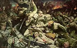 Historian Kenneth O. Morgan described Wales on the eve of the First World War as a "relatively placid, self-confident and successful nation". The output from the coalfields continued to increase, with the Rhondda Valley recording a peak of 9.6 million tons of coal extracted in 1913.[156] The First World War (1914–1918) saw a total of 272,924 Welshmen under arms, representing 21.5 per cent of the male population. Of these, roughly 35,000 were killed,[157] with particularly heavy losses of Welsh forces at Mametz Wood on the Somme and the Battle of Passchendaele.[158]