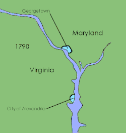 The Residence Act authorized President George Washington to select the actual location of the site.[21] However, he wished to include Alexandria, Virginia, within the federal district. To accomplish this, the boundaries of the federal district would need to encompass an area on the Potomac that was downstream of the mouth of the Eastern Branch.