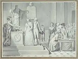 Blainey wrote that "atheism seized the pedestal in revolutionary France in the 1790s. The secular symbols replaced the cross. In the cathedral of Notre Dame the altar, the holy place, was converted into a monument to Reason..." During the Terror of 1792–93, France's Christian calendar was abolished, monasteries, convents and church properties were seized and monks and nuns expelled. Historic churches were dismantled.[112] The Cult of Reason was a creed based on atheism devised during the French Revolution by Jacques Hébert, Pierre Gaspard Chaumette, and their supporters. It was stopped by Maximilien Robespierre, a Deist, who instituted the Cult of the Supreme Being.[113] Both cults were the outcome of the "de-Christianization" of French society during the Revolution and part of the Reign of Terror.