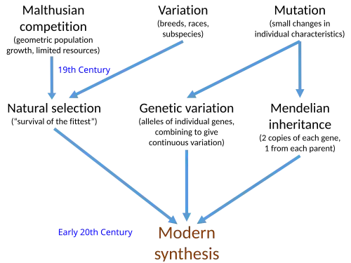 In 1858 Charles Darwin and Alfred Russel Wallace published a new evolutionary theory, explained in detail in Darwin's On the Origin of Species (1859). Darwin's theory, originally called descent with modification, is known contemporarily as Darwinism or Darwinian theory. Unlike Lamarck, Darwin proposed common descent and a branching tree of life, meaning that two very different species could share a common ancestor. Darwin based his theory on the idea of natural selection: it synthesized a broad range of evidence from animal husbandry, biogeography, geology, morphology, and embryology. Debate over Darwin's work led to the rapid acceptance of the general concept of evolution, but the specific mechanism he proposed, natural selection, was not widely accepted until it was revived by developments in biology that occurred during the 1920s through the 1940s. Before that time most biologists regarded other factors as responsible for evolution. Alternatives to natural selection suggested during "the eclipse of Darwinism" (c. 1880 to 1920) included inheritance of acquired characteristics (neo-Lamarckism), an innate drive for change (orthogenesis), and sudden large mutations (saltationism). Mendelian genetics, a series of 19th-century experiments with pea plant variations rediscovered in 1900, was integrated with natural selection by Ronald Fisher, J. B. S. Haldane, and Sewall Wright during the 1910s to 1930s, and resulted in the founding of the new discipline of population genetics. During the 1930s and 1940s population genetics became integrated with other biological fields, resulting in a widely applicable theory of evolution that encompassed much of biology—the modern synthesis.