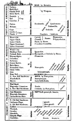 Knowledge of the fossil record continued to advance rapidly during the first few decades of the 19th century. By the 1840s, the outlines of the geologic timescale were becoming clear, and in 1841 John Phillips named three major eras, based on the predominant fauna of each: the Paleozoic, dominated by marine invertebrates and fish, the Mesozoic, the age of reptiles, and the current Cenozoic age of mammals. This progressive picture of the history of life was accepted even by conservative English geologists like Adam Sedgwick and William Buckland; however, like Cuvier, they attributed the progression to repeated catastrophic episodes of extinction followed by new episodes of creation.[65] Unlike Cuvier, Buckland and some other advocates of natural theology among British geologists made efforts to explicitly link the last catastrophic episode proposed by Cuvier to the biblical flood.[66][67]