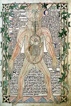 The Greek Galen (c. 129–216 CE) was one of the greatest physicians of the ancient world, as his theories dominated all medical studies for nearly 1500 years.[88] His theories and experimentation laid the foundation for modern medicine surrounding the heart and blood. Galen's influence and innovations in medicine can be attributed to the experiments he conducted, which were unlike any other medical experiments of his time. Galen strongly believed that medical dissection was one of the essential procedures in truly understanding medicine. He began to dissect different animals that were anatomically similar to humans, which allowed him to learn more about the internal organs and extrapolate the surgical studies to the human body.[88] In addition, he performed many audacious operations—including brain and eye surgeries—that were not tried again for almost two millennia. Through the dissections and surgical procedures, Galen concluded that blood is able to circulate throughout the human body, and the heart is most similar to the human soul.[88][89] In Ars medica ("Arts of Medicine"), he further explains the mental properties in terms of specific mixtures of the bodily organs.[90][91] While much of his work surrounded the physical anatomy, he also worked heavily in humoral physiology.