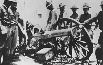 The Spanish soldiers in the forts of Puerto Plata and Samaná faced deteriorating conditions. The onset of the rainy season brought widespread sickness. Meanwhile, the Dominicans bombarded Puerto Plata.[42] On October 4, 1863, both the Spaniards and Dominicans pillaged the town. A fight ensued, with 600 Spaniards ultimately driving the Dominicans out of the town, aided by the fort's cannons.[41] In December, a Spanish expedition was launched along the southern seacoast to expel rebel groups weakened by internal conflicts. The Spanish forces drove the rebels from several towns, including Baní, Barahona, Neiba, and San Juan. The capture of Azua resulted in significant Spanish casualties over two months of fighting.[43] Ultimately, the rebels retreated toward Bánica, employing scorched earth tactics and executing Spanish prisoners during their withdrawal.[44] The Captain-General of Santo Domingo, José de la Gándara, adopted a strategy of occupying the northern ports to isolate the dissident Dominican government in Santiago from outside support. However, he overlooked his forces' lack of supplies and poor equipment, as many rifles and cannons were obsolete, and several warships were unseaworthy.[32]