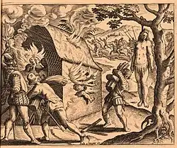 In 1605, Spain was infuriated that Spanish settlements on the northern and western coasts of the island were carrying out large scale and illegal trade with the Dutch, who were at that time fighting a war of independence against Spain in Europe, and the English, a very recent enemy state, and so decided to forcibly resettle the colony's inhabitants closer to the city of Santo Domingo.[24] This action, known as the Devastaciones de Osorio, proved disastrous; more than half of the resettled colonists died of starvation or disease, over 100,000 cattle were abandoned, and many slaves escaped.[25] Five of the existing thirteen settlements on the island were brutally razed by Spanish troops – many of the inhabitants fought, escaped to the jungle, or fled to the safety of passing Dutch ships. The settlements of La Yaguana, and Bayaja, on the west and north coasts respectively of modern-day Haiti were burned, as were the settlements of Monte Cristi and Puerto Plata on the north coast and San Juan de la Maguana in the southwestern area of the modern-day Dominican Republic.