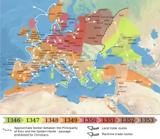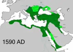 The siege of Baghdad and the death of Abbasid Caliph al-Musta'sim in 1258 temporarily ended the caliphate.[60] When the Khagan Möngke Khan died in 1259, any further Mongol expansion in the region was halted, as the regional military leader Hulegu Khan had to return to the Mongol capital Karakorum for the election of a new khagan. His absence resulted in the first defeat of the Mongols by the Egyptian Mamluks during the Battle of Ain Jalut in 1260.[61] Issues began to arise when the Mongols were unable to reach a consensus as to whom to elect Khagan. Additionally, conflict occurred between traditionalists who wished to retain their nomadic culture and Mongols moving towards sedentary agriculture. All of this led to the fragmentation of the empire in 1260.[62] Hulegu carved out his Middle Eastern territory into the independent Ilkhanate, which included most of Armenia, Anatolia, Azerbaijan, Mesopotamia, and Iran.