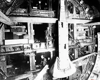 For the project, six tunnel digging shields were to be delivered.[108] These shields comprised cylinders whose diameters were wider than the tunnel bores, and these cylinders contained steel plates of various thicknesses on the face that was to be driven under the riverbed.[26] Four of the shields would dig the Hudson River Tunnel under the river, while the remaining two shields would dig from the Hudson River west bank to the Jersey City portals. They could dig through rock at a rate of 2.5 feet (0.76 m) per day, or through mud at a daily rate of 5 to 6 feet (1.5 to 1.8 m). The air compressors would provide an air pressure of 20 to 45 pounds per square inch (140 to 310 kPa).[116] The shovels used to dig the tunnel were provided by the Marion Power Shovel Company,[117] while the six digging shields were built by the Merchants Shipbuilding Corporation.[118] The air compressor was completed in September 1922, and the first shield was fitted into place in the Manhattan side's construction shaft. By this point, the shafts on the New Jersey side were being excavated, and two watertight caissons were being constructed.[119][26]