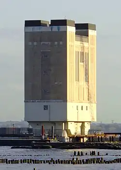 The shafts within the river rise 107 feet (33 m) above mean high water. Their supporting piers descend 45 feet (14 m), of which 40 feet (12 m) are underwater and 5 feet (1.5 m) are embedded in the riverbed.[3]: 5 [24] The river shafts double as emergency exits by way of shipping piers that connected each ventilation shaft to the shoreline.[3]: 6 The New York Land Ventilation Tower, a five-story building with a trapezoidal footprint, is 122 feet (37 m) tall. The New Jersey Land Ventilation Tower is a four-story, 84-foot (26 m) building with a rectangular perimeter.[3]: 5