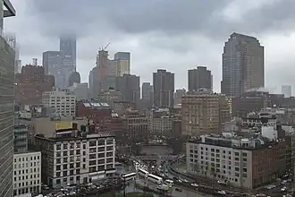 A business improvement district for the area, the Hudson Square Connection, was founded in 2009 with the goal of repurposing the square for pedestrian use.[43][45] Hudson Square Connection and the Port Authority collaborated to create a five-year, $27 million master plan for Freeman Plaza.[46] In 2013, Freeman Plaza West was opened to the public. Bounded by Hudson, Broome, and Watts Streets, it features umbrellas, bistro tables and chairs, and tree plantings.[47]
