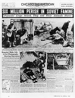 The word was used in print in the 1930s in Ukrainian diaspora publications in Czechoslovakia as Haladamor,[22] and by Ukrainian immigrant organisations in the United States and Canada by 1978;[23][24][25] in the Soviet Union, of which Ukraine was a constituent republic, any references to the famine were dismissed as anti-Soviet propaganda, even after de-Stalinization in 1956, until the declassification and publication of historical documents in the late 1980s made continued denial of the catastrophe unsustainable.[12]