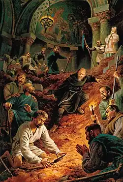 Greek Orthodox sources such as the biography of patriarch Christopher indicate that a relic thought to be the Holy Lance was among the treasures of the church of St. Peter as early as the 10th century.[79] Historian Klaus-Peter Todt has suggested this relic could have been buried to hide it from Seljuk forces in 1084, allowing the crusaders to find it in 1098.[80]: 99