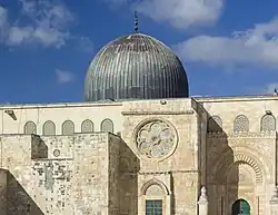 Jerusalem, known in Arabic as Al-Quds (Arabic: الـقُـدس, 'The Holy') has particular significance in Islam. The Quran refers to Muhammad's experiencing the Isra and Mi'raj as "Glory be to the One Who took His servant ˹Muḥammad˺ by night from the Sacred Mosque to the Farthest Mosque whose surroundings We have blessed, so that We may show him some of Our signs".[Quran 17:1] Ahadith infer that the "Farthest Masjid" is in Al-Quds; for example, as narrated by Abu Hurairah: "On the night journey of the Apostle of Allah, two cups, one containing wine and the other containing milk, were presented to him at Al-Quds (Jerusalem). He looked at them and took the cup of milk. Angel Gabriel said, 'Praise be to Allah, who guided you to Al-Fitrah (the right path); if you had taken (the cup of) wine, your Ummah would have gone astray'." Jerusalem was Islam's first Qiblah (direction of prayer) in Muhammad's lifetime, however, this was later changed to the Kaaba in the Hijazi city of Mecca, following a revelation to Muhammad by the Archangel Jibril.[28] The current construction of the Al-Aqsa mosque, which lies on the Temple Mount in Jerusalem, is dated to the early Umayyad period of rule in Palestine. Architectural historian K. A. C. Creswell, referring to a testimony by Arculf, a Gallic monk, during his pilgrimage to Palestine in 679–82, notes the possibility that the second caliph of the Rashidun Caliphate, Umar ibn al-Khattab, erected a primitive quadrangular building for a capacity of 3,000 worshipers somewhere on the Haram ash-Sharif. However, Arculf visited Palestine during the reign of Mu'awiyah I, and it is possible that Mu'awiyah ordered the construction, not Umar. This latter claim is explicitly supported by the early Muslim scholar al-Muthahhar bin Tahir.[29] According to the Quran and Islamic traditions, Al-Aqsa Mosque is the place from which Muhammad went on a night journey (al-isra) during which he rode on Buraq, who took him from Mecca to al-Aqsa.[30] Muhammad tethered Buraq to the Western Wall and prayed at al-Aqsa Mosque and after he finished his prayers, the angel Jibril (Gabriel) traveled with him to heaven, where he met several other prophets and led them in prayer.[31] The historical significance of the al-Aqsa Mosque in Islam is further emphasized by the fact that Muslims turned towards al-Aqsa when they prayed for a period of 16 or 17 months after migration to Medina in 624; it thus became the qibla ('direction') that Muslims faced for prayer.[32]
