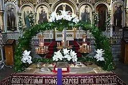 Holy Week (Koine Greek: Ἁγία καὶ Μεγάλη Ἑβδομάς, romanized: Hagía kaì Megálē Hebdomás, lit. 'Holy and Great Week') commemorates the seven days leading up to Easter. It begins with the commemoration of Christ's triumphal entry into Jerusalem on Palm Sunday, marks the betrayal of Jesus on Spy Wednesday (Holy Wednesday), climaxing with the commemoration of the Last Supper on Maundy Thursday (Holy Thursday) and the Passion of Jesus on Good Friday (Holy Friday). Holy Week concludes with Christ's death and descent into hell on Holy Saturday.[1][2][3] For all Christian traditions, it is a moveable observance. In Eastern Christianity, which also calls it Great Week, it is the week following Great Lent and Lazarus Saturday, starting on the evening of Palm Sunday and concluding on the evening of Great Saturday.[4] In Western Christianity,[A] Holy Week is the sixth and last week of Lent, beginning with Palm Sunday and concluding on Holy Saturday.[6][3][1][2]
