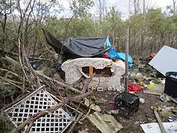 Many homeless enumeration studies published in the 2010s and onward utilize the term unsheltered homeless.[14][15][16][17] The common colloquial term street people does not fully encompass all unsheltered people, in that many such persons do not spend their time in urban street environments. Many shun such locales, because homeless people in urban environments may face the risk of being robbed or assaulted. Some people convert unoccupied or abandoned buildings ("squatting"), or inhabit mountainous areas or, more often, lowland meadows, creek banks, and beaches.[18]