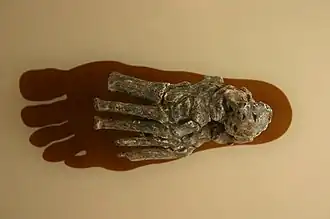 OH 8, a foot, is better suited for terrestrial movement than the foot of A. afarensis, though it still retains many apelike features consistent with climbing.[18] However, the foot has projected toe bone and compacted mid-foot joint structures, which restrict rotation between the foot and ankle as well as at the front foot. Foot stability enhances the efficiency of force transfer between the leg and the foot and vice versa, and is implicated in the plantar arch elastic spring mechanism which generates energy while running (but not walking). This could possibly indicate H. habilis was capable of some degree of endurance running, which is typically thought to have evolved later in H. ergaster / H. erectus.[43]