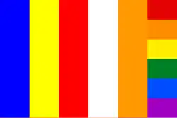 Artistic representation of the intersection of Buddhism and LGBTQ people shown by the Buddhist flag and rainbow flag.