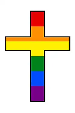 Symbolic depiction of the intersection of Christianity and LGBTQ people, combining the Christian cross and LGBTQ rainbow flag