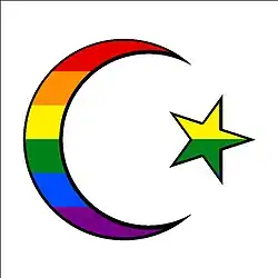 Symbolic depiction of the intersection of Islam and homosexuality combining the crescent and star and rainbow flag