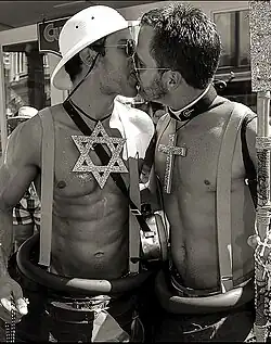 Two men kissing at a pride event while wearing symbols of two Abrahamic religions.