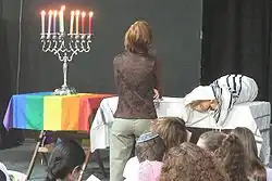 A halakhic egalitarian Pride minyan in Tel Aviv on the second Shabbat of Hanukkah with a rainbow menorah