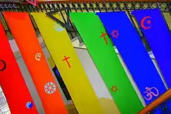 Symbols of the world's largest religions displayed on rainbow flags at the Queer Easter, Germany