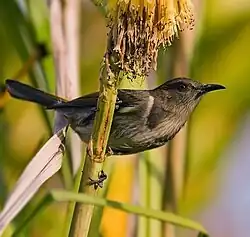 In total, there are 186 species in 55 genera, roughly half of them native to Australia, many of the remainder occupying New Guinea.[4][5] With their closest relatives, the Maluridae (Australian fairy-wrens), Pardalotidae (pardalotes), and Acanthizidae (thornbills, Australian warblers, scrubwrens, etc.), they comprise the superfamily Meliphagoidea and originated early in the evolutionary history of the oscine passerine radiation.[6] Although honeyeaters look and behave very much like other nectar-feeding passerines around the world (such as the sunbirds and flowerpeckers), they are unrelated, and the similarities are the consequence of convergent evolution.