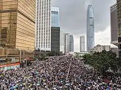 Political debates after the handover have centred around the region's democratic development and the Chinese central government's adherence to the "one country, two systems" principle. After reversal of the last colonial era Legislative Council democratic reforms following the handover,[77] the regional government unsuccessfully attempted to enact national security legislation pursuant to Article 23 of the Basic Law.[78] The central government decision to implement nominee pre-screening before allowing chief executive elections triggered a series of protests in 2014 which became known as the Umbrella Revolution.[79] Discrepancies in the electoral registry and disqualification of elected legislators after the 2016 Legislative Council elections[80][81][82] and enforcement of national law in the West Kowloon high-speed railway station raised further concerns about the region's autonomy.[83] In June 2019, mass protests erupted in response to a proposed extradition amendment bill permitting the extradition of fugitives to mainland China. The protests are the largest in Hong Kong's history,[84] with organisers claiming to have attracted more than three million Hong Kong residents.