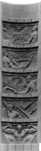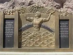 The men who removed this rock were called "high scalers". While suspended from the top of the canyon with ropes, the high-scalers climbed down the canyon walls and removed the loose rock with jackhammers and dynamite. Falling objects were the most common cause of death on the dam site; the high scalers' work thus helped ensure worker safety.[60] One high scaler was able to save a life in a more direct manner: when a government inspector lost his grip on a safety line and began tumbling down a slope towards almost certain death, a high scaler was able to intercept him and pull him into the air. The construction site had become a magnet for tourists. The high scalers were prime attractions and showed off for the watchers. The high scalers received considerable media attention, with one worker dubbed the "Human Pendulum" for swinging co-workers (and, at other times, cases of dynamite) across the canyon.[61] To protect themselves against falling objects, some high scalers dipped cloth hats in tar and allowed them to harden. When workers wearing such headgear were struck hard enough to inflict broken jaws, they sustained no skull damage. Six Companies ordered thousands of what initially were called "hard boiled hats" (later "hard hats") and strongly encouraged their use.[62]